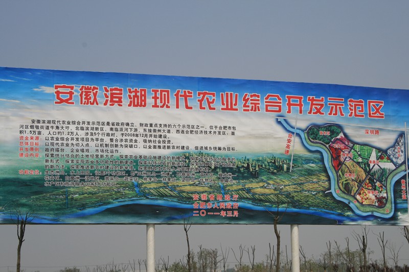 位于合肥市包河区烟墩街道牛角大圩的安徽滨湖现代农业综合开发示范区是省政府确定、省财政重点支持的全省六个现代农业示范园之一,面积1.5万亩,以现代农业建设为重点,设置了苗木、花卉、果蔬、种子等8个功能区,自2008年开始引进8家企业进行市场化运作,目前各项建设已初具雏型。“大圩生态农业示范区”被誉为合肥近郊都市里的最美乡村,该示范区采取政府扶持、农民自建等方式,重点发展以果蔬采摘、休闲垂钓等“农家乐”为主的项目,受到了合肥市民的青睐。